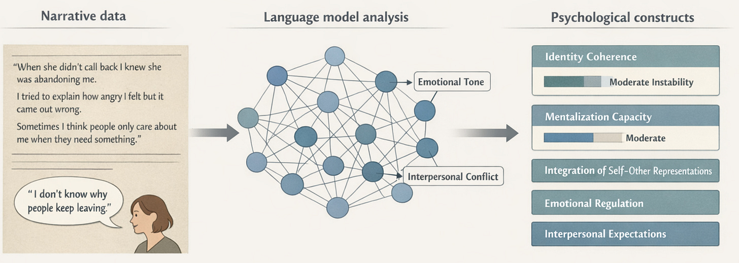For decades, psychodynamic researchers have relied on narrative assessment traditions to study constructs that don’t show up well in self-report. Rather than asking people to endorse statements on a Likert scale, these approaches analyze how individuals talk about themselves and others in extended interviews. The underlying assumption is simple: psychological capacities reveal themselves in the structure and content of a person’s narrative. Coherence, complexity, emotional nuance, and the ability to hold ambivalent representations of self and others all become visible in how someone tells their story.