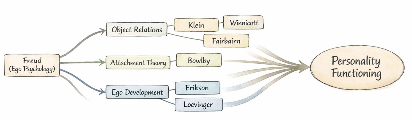 One of the frustrations I have with how personality functioning (PF) gets discussed is that the conversation often starts and ends with the Alternative Model of Personality Disorders (AMPD). In reality, the ideas behind PF have a much longer intellectual history. The AMPD didn’t invent the concept; it operationalized a set of developmental capacities that multiple traditions in psychology had already been describing for decades.