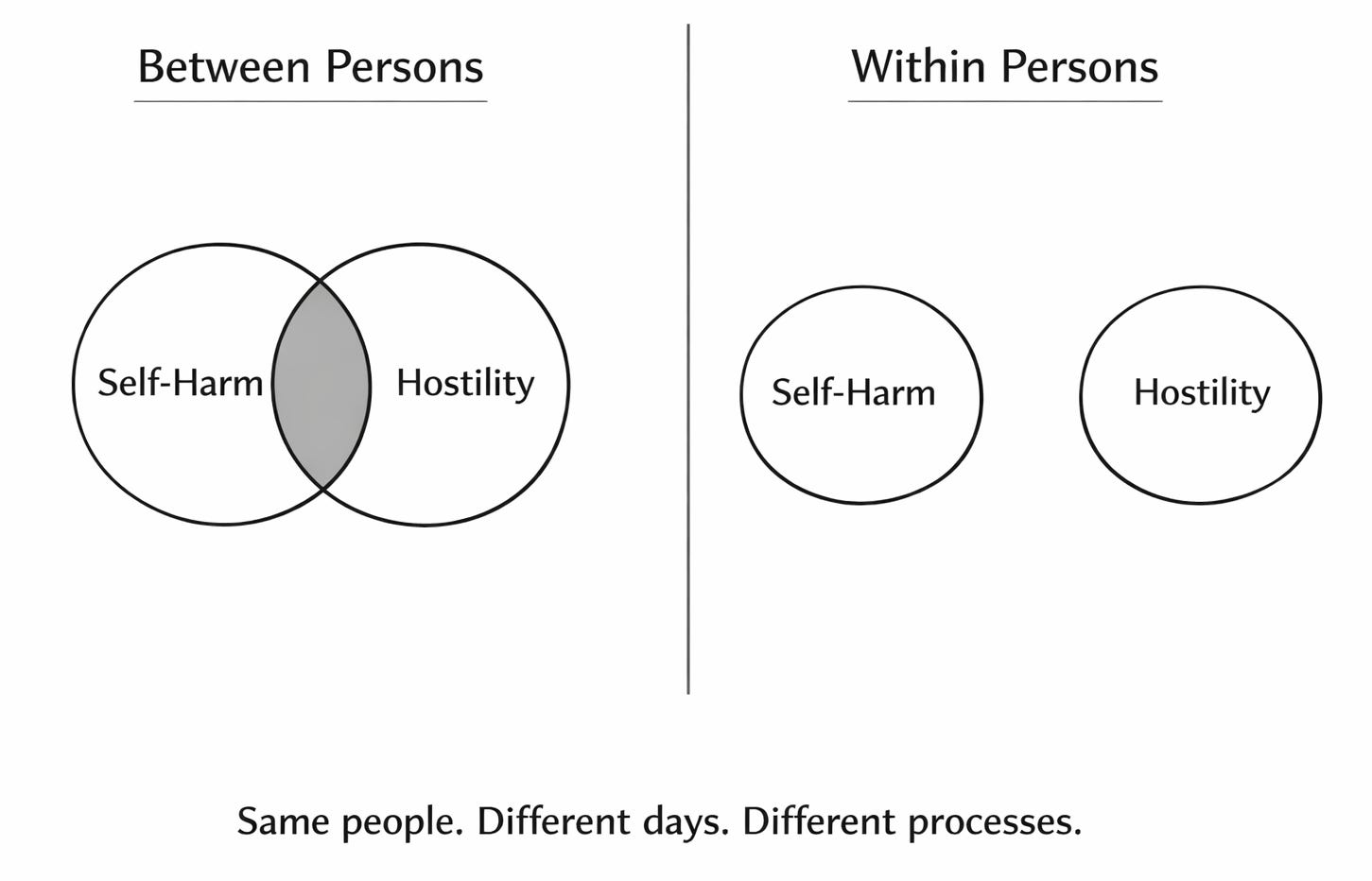 But the multilevel analysis adds a critical new piece of information: at the within-person level, self-harm showed no association with hostile aggression. On a day when someone harms themselves, they are not more hostile toward others than usual. The processes generating self-directed harm and other-directed harm are dynamically distinct within persons, even though the people who engage in self-harm tend also to be people elevated on hostility between persons.