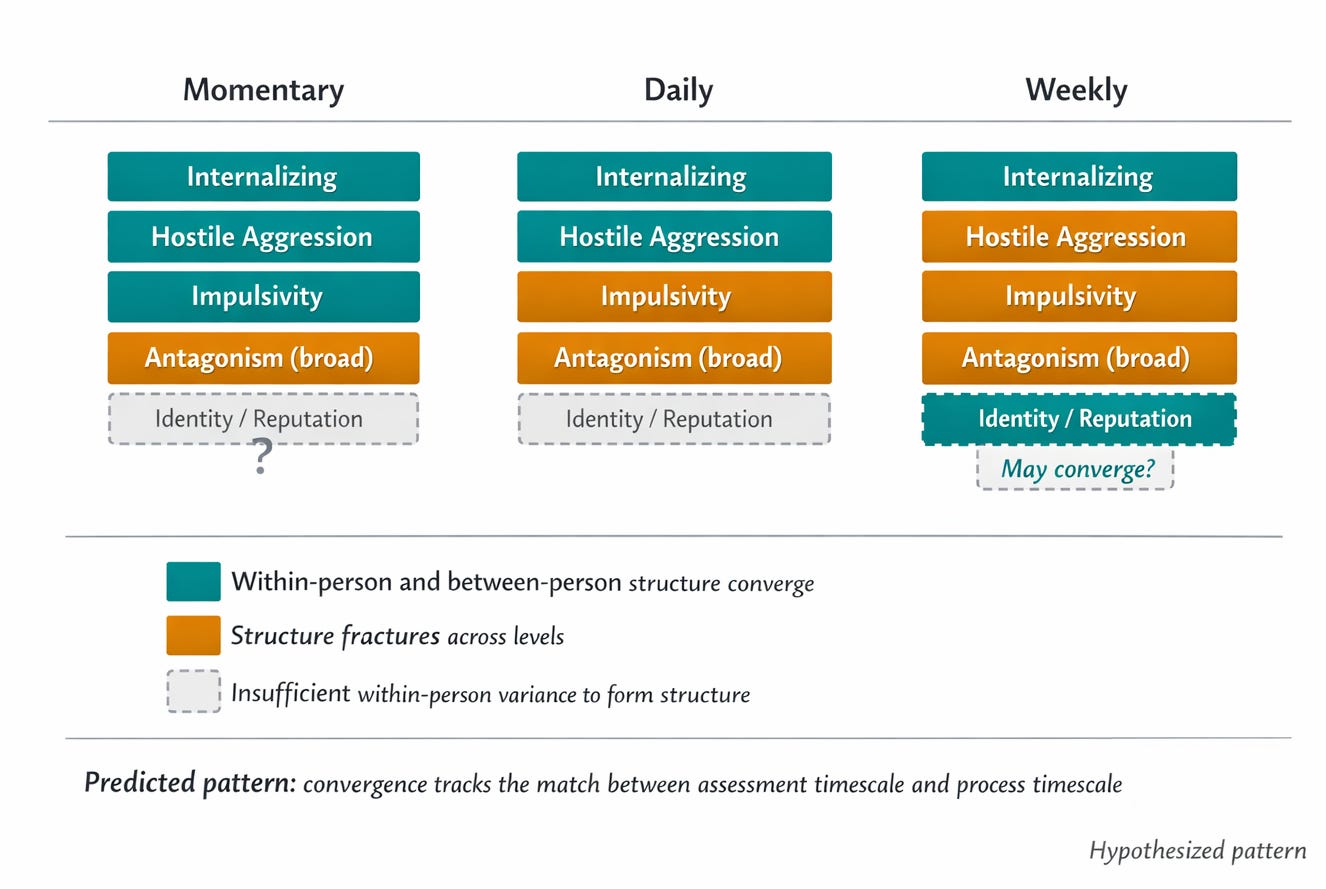 The strong test would be a study measuring the same constructs at momentary, daily, and weekly timescales in the same individuals, then comparing the factor structures that emerge at each level. The timescale hypothesis predicts specific, differential patterns of convergence and fracture across assessment windows. If hostile aggression converges at the momentary level but fractures at the daily level, that tells you something precise about its temporal grain. If callousness never shows within-person structure at any timescale, that suggests it is a genuinely dispositional construct without meaningful short-term fluctuation, at least in the populations studied.