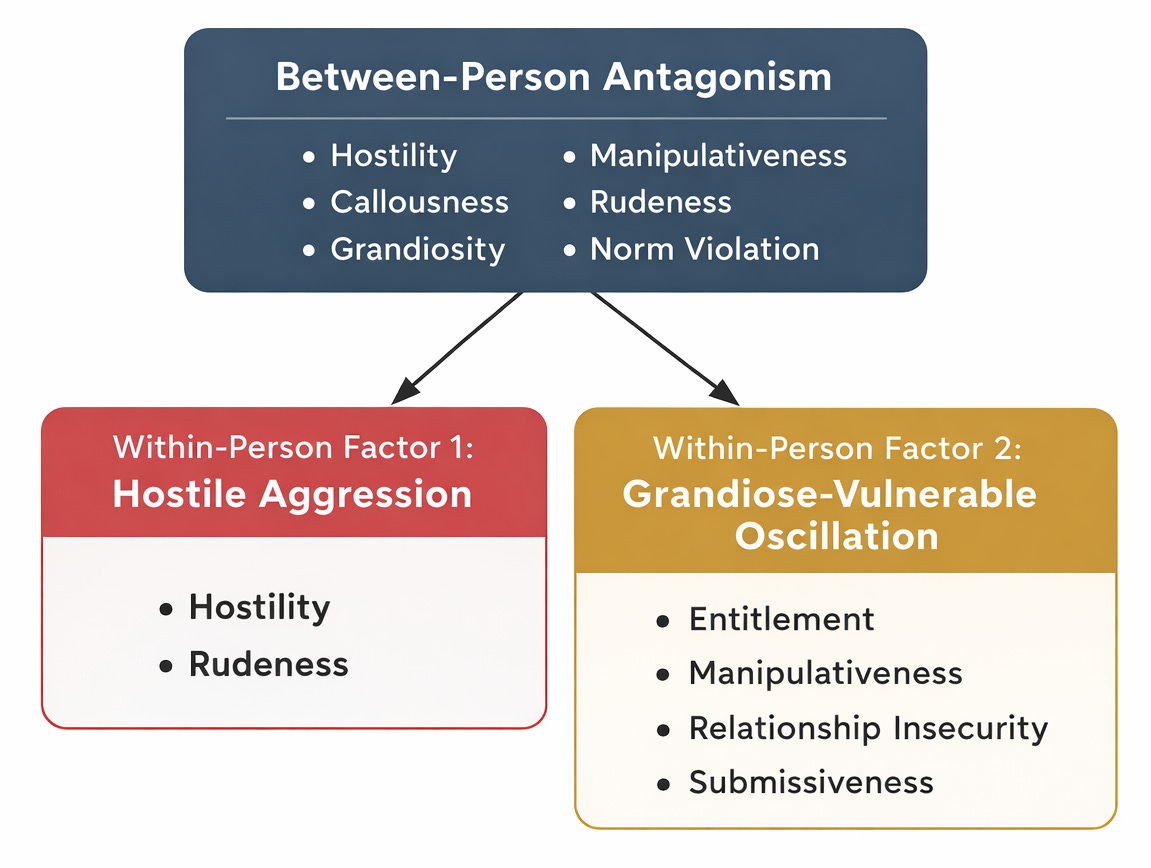 The point: this dynamic is invisible at the between-person level. Average across days and individuals and the grandiose moments and insecure moments cancel out or separate onto different factors. The between-person map says antagonistic people are not submissive. The within-person map says the same person is often both, and that this oscillation may be the pathology itself.