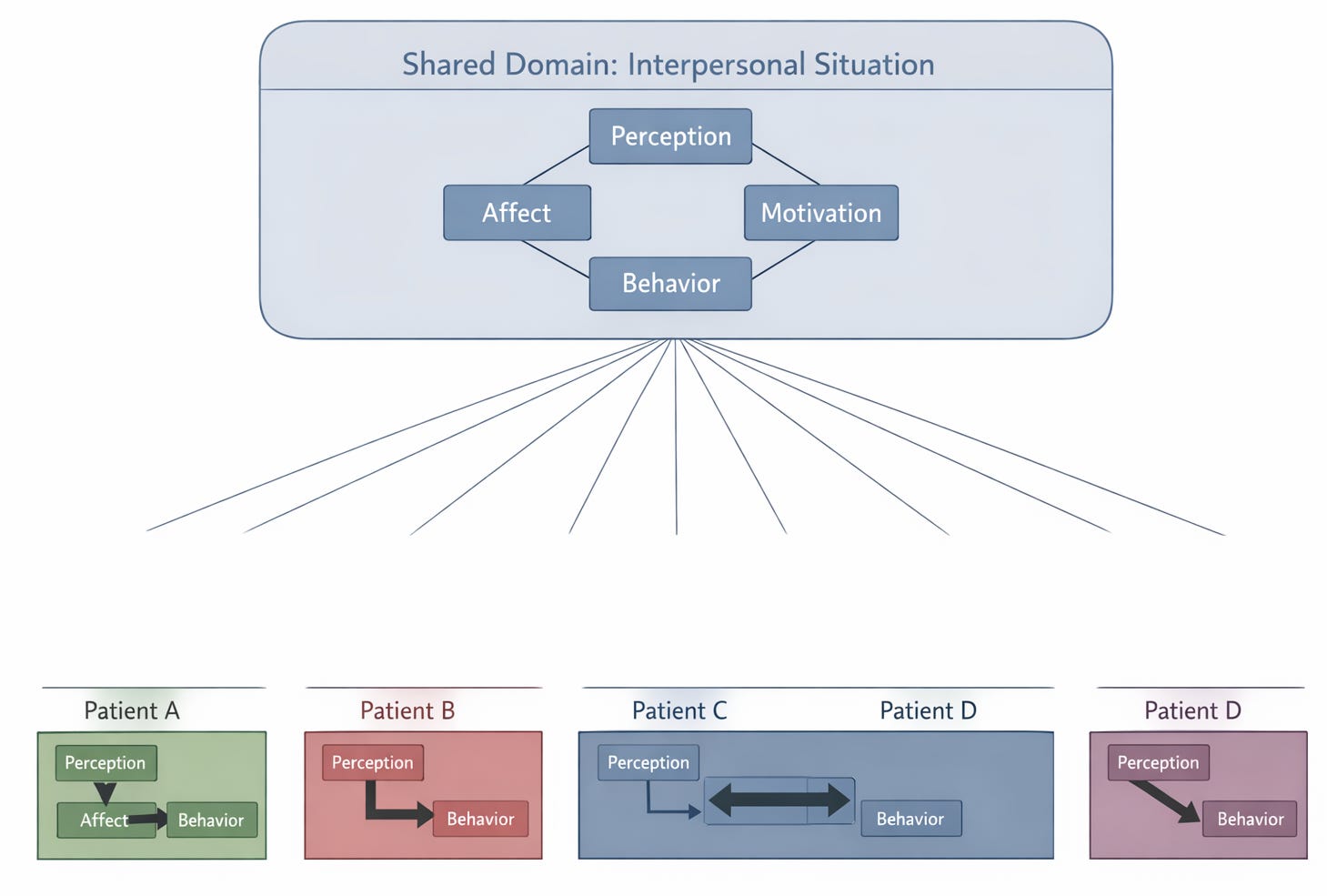 These are not contradictory once you place them in a hierarchy. The interpersonal situation, as elaborated by contemporary integrative interpersonal theory (Sullivan, 1953; Pincus, 2005; Pincus & Hopwood, 2012), is the shared stage on which person-specific dramas play out. Every patient with an interpersonal disorder has dysfunction manifesting in interpersonal situations. But the specific component of the situation that breaks down (perception versus behavior versus affect versus motivation), the specific interpersonal content involved (agency versus communion), and the specific dynamic pattern (rigidity versus instability versus amplification) are all person-specific.