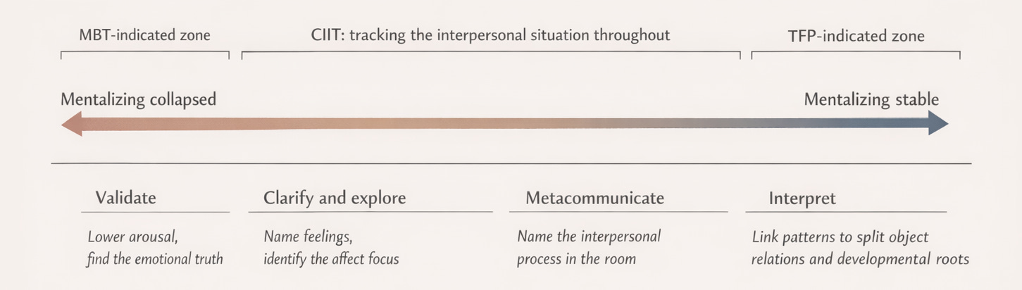 This is a real tension, not a superficial one. The question is: can a clinician know when to use which? CIIT’s answer is yes, because the interpersonal situation tells you what the patient needs at a given moment. When mentalizing has collapsed and the patient is in psychic equivalence, an interpretation will not land. It will be experienced as the therapist imposing their reality onto the patient’s, which is exactly the kind of interaction that reinforces the problem. In that moment, the MBT approach is indicated: slow down, validate, bring mentalizing back online. When mentalizing is more stable and the patient has some observing distance, interpretation becomes possible and even powerful. The patient can hold the therapist’s hypothesis alongside their own experience without feeling invaded by it.