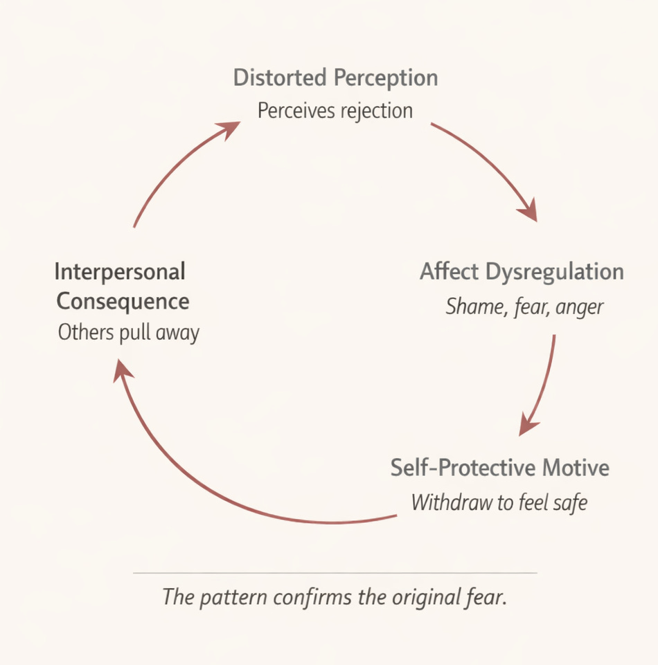 The framework calls this a vicious circle driven by parataxic distortion (Sullivan’s term for the way internalized relationship templates distort the perception of current interactions) and self-protective motives (rigid or chaotic efforts to restore felt security when it feels threatened).
